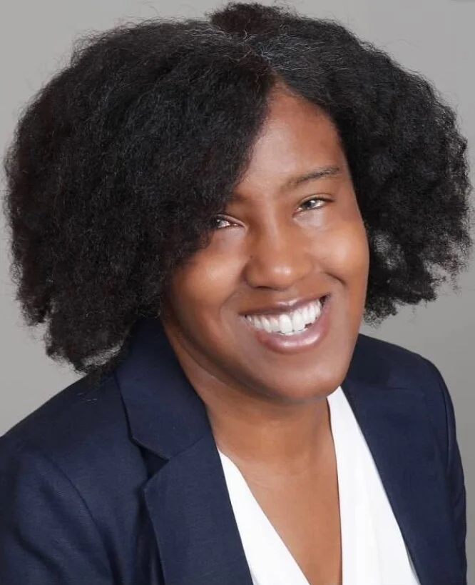 A photo of a woman wearing a navy blue blazer and white blouse looking and smiling cheerfully into a camera